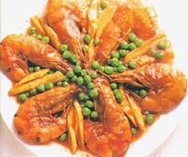 c.燒紅鍋下油,筍絲及青豆翻炒加鹽,糖,太白粉勾芡待滾后淋在明蝦上,便可食用.